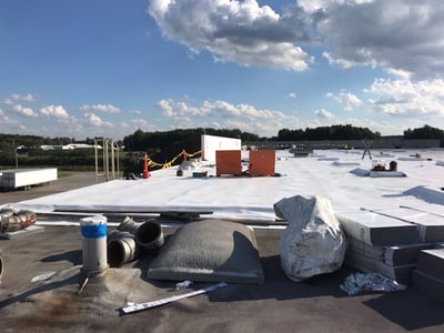 Description of Work: Now focusing on a new area of the M&M warehouse located in Madison, IN, the team encounters a large rusted out section of metal decking that required more than simply a membrane installation. After installing a set of freshly made panels, they covered up the damaged section and continued their metal roof recover!
